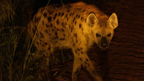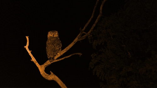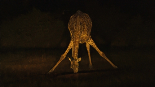 The landscape feels noticeably different. Part of this is due to the change in the human sensory experience – as it gets darker, we can’t see very far into the landscape, and while during the day your eyes would stretch out to find the horizon, at night we are limited to what’s immediately visible in the amber glow of the car headlights that tint everything slightly orange. Sightings are few and far between. The occasional hyena weaves in and out of the dirt road, apparently unperturbed by the roaring Land Cruiser engine. A cautious Spotted Eagle Owl is perched high on a branch. Dozens of impala far off the road are given away by their eyes reflecting the glow of the headlights, and a jackal bounds across the scene with energetic, determined steps. A giraffe crouches down to drink water from a pool, and it suddenly stopping and moving away alerts us to a lone hyena nearby.